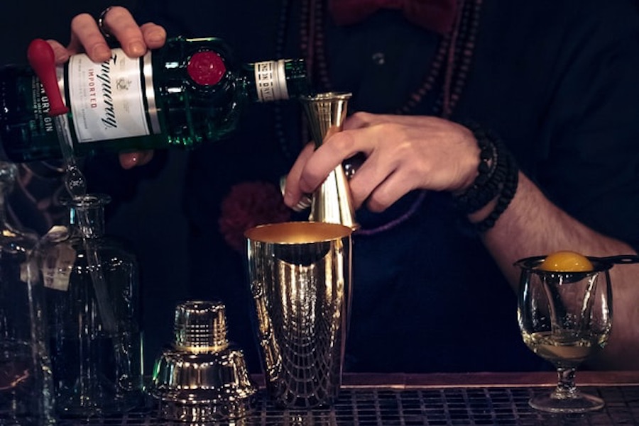 ・シェーカーを持った指先が冷たくなり、シェーカーの表面が霜の降ったような感じになったところで、トップをはずし人差し指でストレーナーを押えながらグラスに注ぎます。